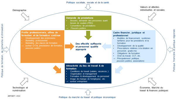 De multiples facteurs influencent et déterminent la situation sur le marché du travail. ARTISET et ses associations de branche CURAVIVA, INSOS et YOUVITA agissent de manière ciblée aux niveaux institutionnel et politique sur les facteurs à modifier face à la pénurie de personnel qualifié.